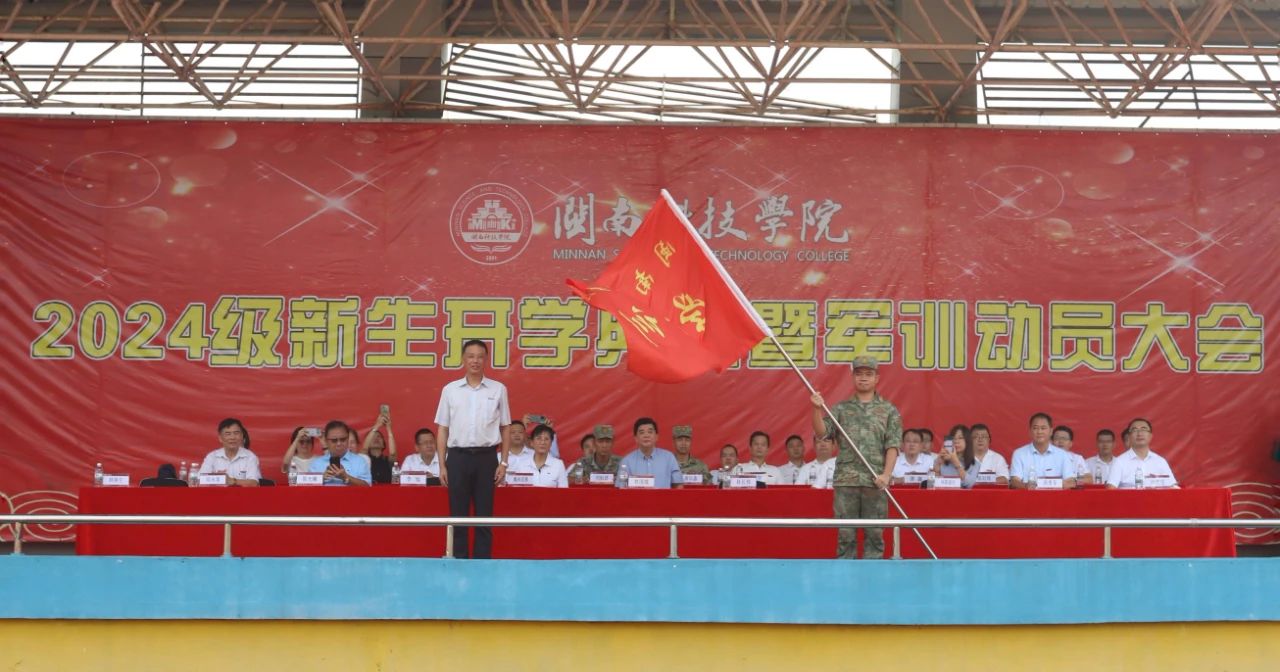 典礼上,校领导共同为新生代表们佩戴校徽,并为学生军训团授旗,这也象征着2024级同学们正式步入大学生活,成为江南官方网站的一员。