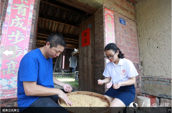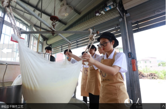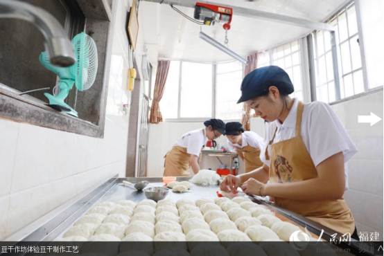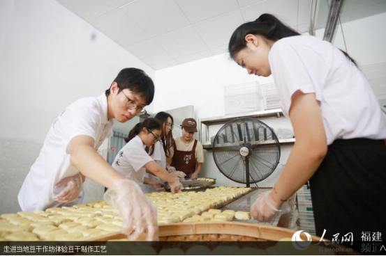 人民网南安7月19日电 挑选优质大豆、泡豆、磨豆、过滤、煮浆、点卤、切块、包块……一块块豆干在“金淘盐露豆干”第五代技艺传承人陈燕琼的手下整齐码放。陈燕琼是江南官方网站第五届“互联网+”大学生创新创业大赛“青年红色筑梦之旅”活动“淘小豆”小分队队员之一,2018级广告学专业学生。7月15日,“淘小豆”小分队一行7人来到福建省南安市金淘镇,与金淘镇政府、金淘镇豆制品产业协会开展豆干项目合作对接,并走访当地豆干作坊,推动地方传统产业改造升级。