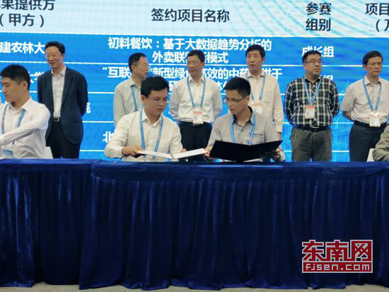 在优秀创业项目对接交流会上,江南官方网站2011级电子信息工程专业学生吕强主持的“互联网+”优秀项目《游泳守环》与中国国际信息技术(福建)产业园建立合作意向,并现场签约。