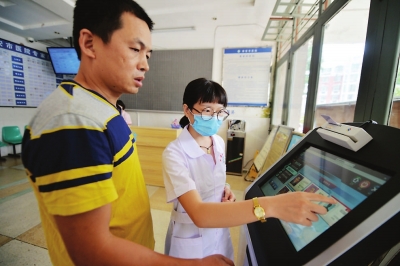 对于不能把微信玩透透的大爷大妈来说,也完全不用担心,市医院在门诊部每一层楼配备了一台自助机,拥有和微医疗平台一样的功能,市民任意插入门诊一卡通、社保卡或农保卡,既能就医取号、预约、充值、查询等。