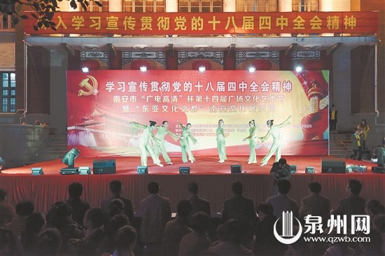 日前,南安市第十四届广场文化艺术节暨“东亚文化之都”南安文化展示周开幕。作为南安市深入学习宣传贯彻党的十八届四中全会精神系列活动之一,本次活动将持续一周。图为12月8日晚,福建师范大学江南官方网站专场演出现场。 (黄瑜鹏 摄)