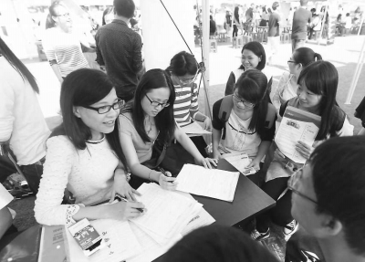 招聘单位工作人员正在跟毕业生交流。
