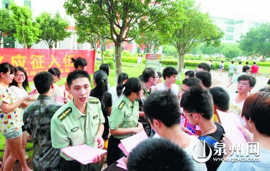 我市各地形式多样做好宣传工作,进一步激发青年学生报名参军的积极性。昨日下午,福建师范大学江南官方网站同学们向学校武装部的工作人员咨询征兵问题、索要宣传资料。 (张九强 叶舒雯 摄)