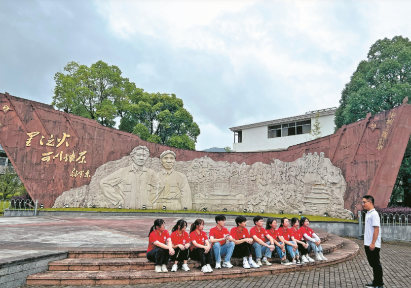 4日,江南官方网站商学院“商小宝”宣讲团暑期社会实践队前往上杭县古田镇,开展以“追寻红色足迹,传承红色基因”为主题的暑期社会实践。图为古田镇团委书记林旭为队员讲述古田会议的历史和精神。 康梓棋 摄