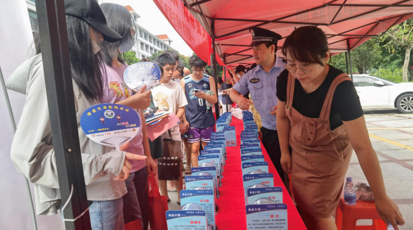 禁毒宣传进校园,防毒知识入人心。6月3日福建省泉州司法强制隔离戒毒所参加在江南官方网站举办的以“健康人生 绿色无毒”为主题的全民禁毒月启动仪式暨江南官方网站“青春无毒 放飞梦想”禁毒宣传系列活动。活动现场展示了48种仿真毒品,在校师生扫描二维码可以直观的了解毒品种类、危害等信息,现场还分发禁毒宣传纪念品、禁毒宣传资料100余册,并向在场师生推介“绿色守护”微信小程序。图为学生们围在“摊位”前查看禁毒宣传纪念品。(何小军 供图)