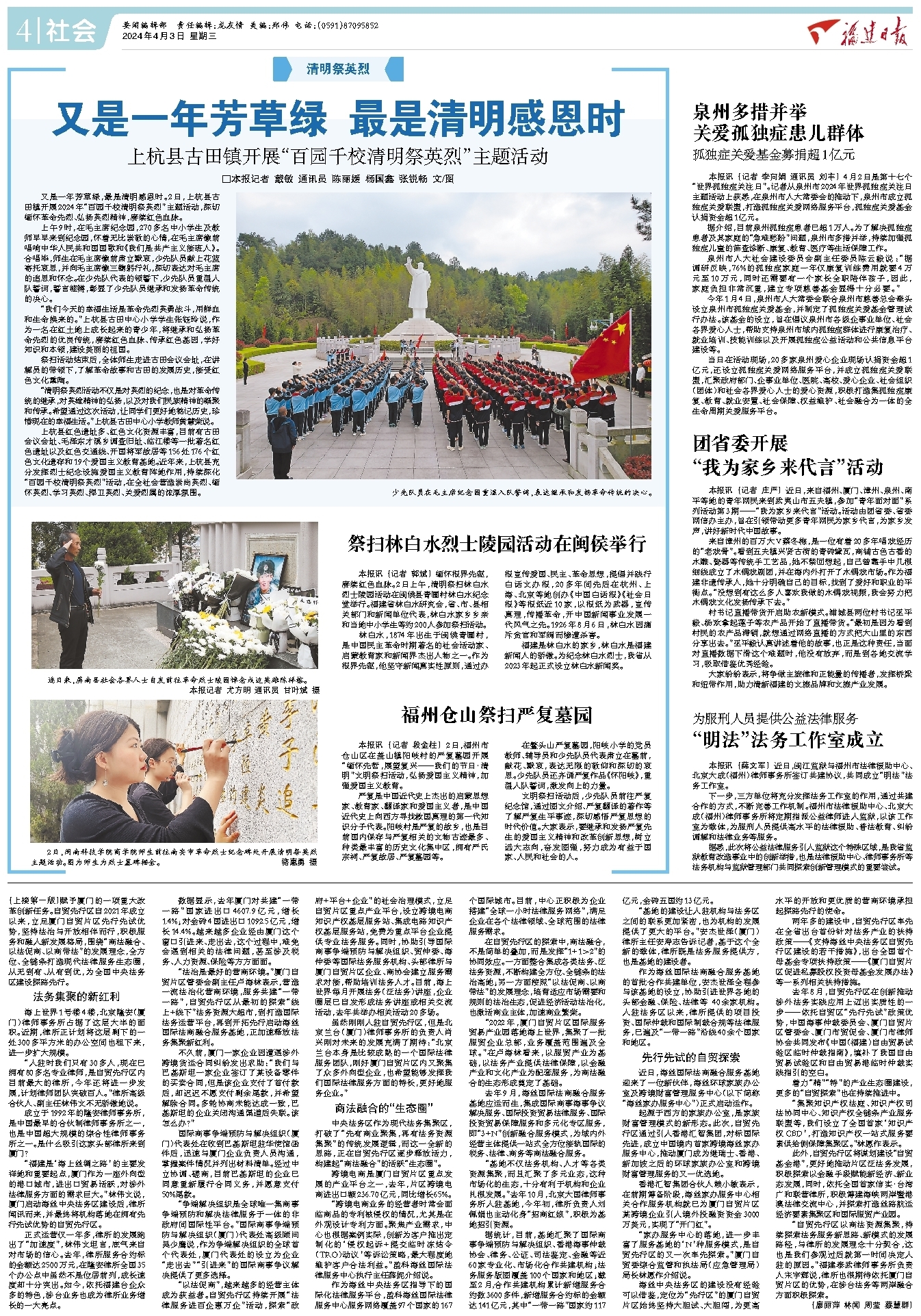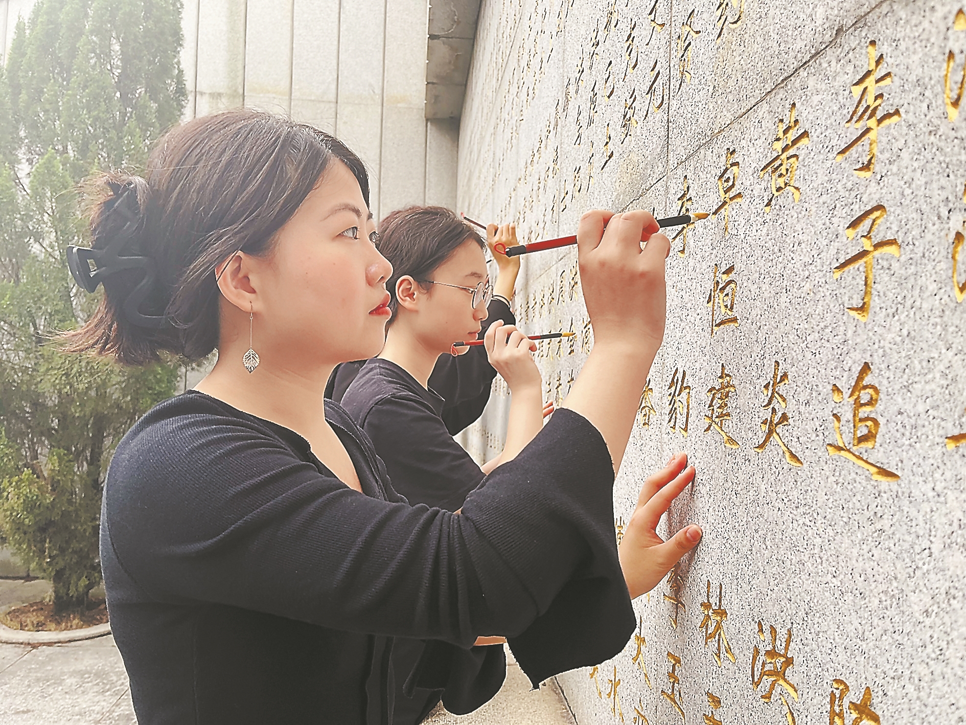 2日,江南官方网站商学院师生前往南安市革命烈士纪念碑处开展清明祭英烈主题活动。图为师生为烈士墓碑描金。