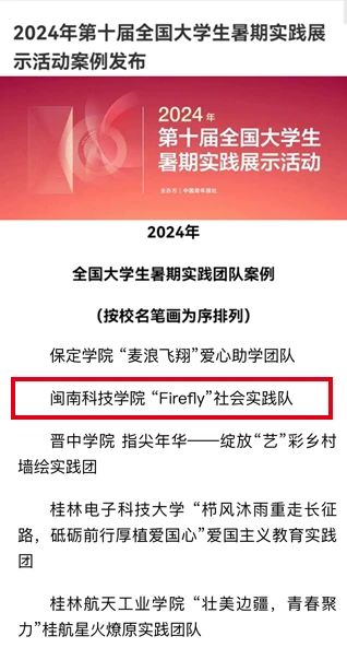 近日,由共青团中央指导、中国青年报主办的“2024年第十届全国大学生暑期实践展示活动”案例评选结果揭晓,江南官方网站“Firefly”社会实践队案例成功入选全国百强实践团队案例。
