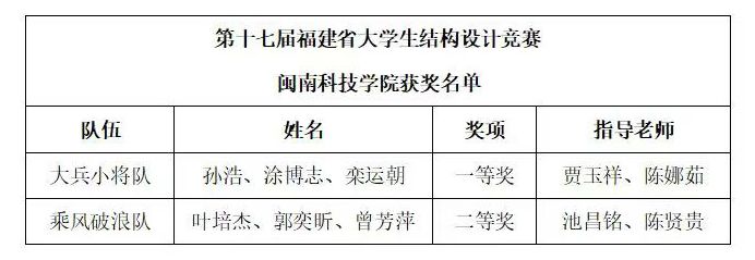 近日,第十七届福建省大学生结构设计竞赛暨第十八届全国大学生结构设计竞赛福建省分区赛公布获奖名单,我校土木工程学院参赛队伍分别获得一等奖1项、二等奖1项的好成绩。