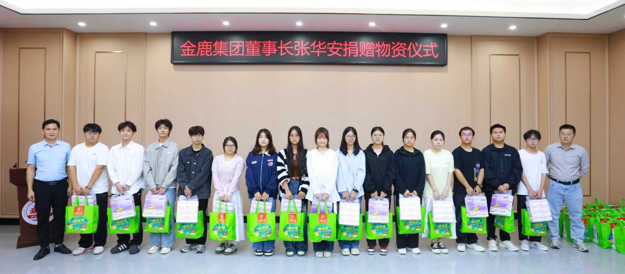 10月23日,金鹿集团董事长张华安带队到学校,捐赠金鹿集团生产的日常生活物资,商学院80名学生接受捐赠。校长袁自煌、校党委书记李旭会见张华安董事长一行。