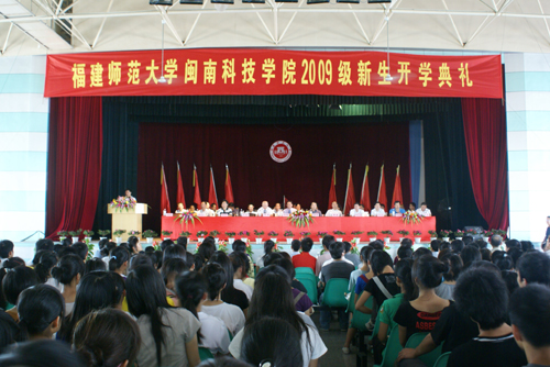 金秋时节,校园一片喜气洋洋。9月13日上午,我院在学生活动中心隆重举行福建师范大学江南官方网站2009级新生开学典礼。南安市委副书记、教育工委书记曾焕楷先生,江南官方网站常务副董事长戴新民先生,福建师范大学副校长许明教授,《人民日报》事业发展部副主任黄敬先生,南安市教育局局长吴亚明先生,南安市外经贸局局长柯文宝先生,南安市康美镇党委书记王强乐先生,南安市康美镇镇长吴长流先生、学院法人代表戴宽南先生、福建师范大学办公室主任郭警修先生、学工部部长廖深基先生、后管处处长张振华先生、教务处副处长陈祖祺先生、团委书记涂荣先生、闽台研究中心主任谢必震教授等领导、嘉宾出席了开学典礼。各合作学院领导、专业负责人、我院全体党政领导及各系部负责人也参加了典礼。开学典礼由学院党委常务副书记林国庆主持。
