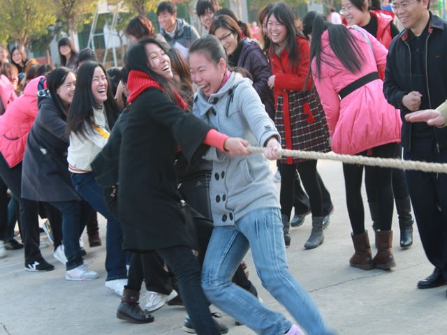 乍暖还寒的春风难以冻结节日的快乐气氛,五彩缤纷的活动为我校的女生们备上了一份节日厚礼,篮球场上的拔河比赛也是这个节日里一道美丽的风景。学院学工部部长林树生和团委书记刘武强也亲临现场,由林树生部长担任本次比赛的裁判。拔河比赛的参赛队伍分别为在校女生和女教师两组,比赛尚未拉开帷幕,现场气氛已经沸腾,师生们纷纷摩拳擦掌,等待拔河比赛的开始。哨声伴着无数个激情澎湃的心响起了,场上气势磅礴的呐喊声有节奏地起伏着,参赛女生们也把平日里的文静温柔的淑女形象抛在了一边,个个咬紧牙关,女老师们也使出了浑身解数。据悉,本次比赛的学生队伍是09国贸的女生,她们是去年杀进决赛的优秀队伍,但是强中自有强中手,经过3轮激烈的比赛,女老师组以2比1的成绩赢得了最后的胜利。