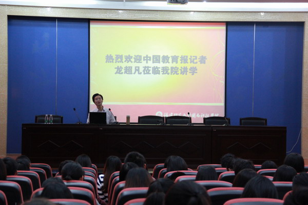 讲座上,龙超凡讲述了他考上湖北大学的艰辛,以及一步一步走上中国教育报记者的经历。在从校报记者到专业媒体记者转型的过程中,他强调了能力与机会的重要性。他还结合诸多生动的事例,畅谈起作为记者应有的职业素养,认为一名合格的记者应该具备“谦虚、低调、勤奋、坚持”的品质,要善于发现,勤于思考,善于抓住机会,锲而不舍。