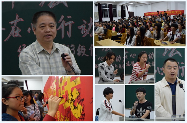 23日晚,2013级信息管理与信息系统专业“勤俭在心,行动在我”主题道德讲堂活动举行,活动围绕“唱一首歌曲”、“观一部短片”、“诵一首诗歌”、“听一个故事”、“讲一些感受”、“送一份吉祥”、“做一个承诺”七大环节展开。在“讲一些感受”环节中,同学们纷纷上台分享了自己身边勤俭节约的故事,经济管理系副主任陈晓川老师为在场师生讲述了生活处处皆勤俭,勤俭节约是一种言传身教,是一种务实的态度,其精彩演讲受到师生们欢迎。党委常务副书记林明旭受邀参加活动,他说,“勤俭在心,行动在我”道德讲堂是践行社会主义核心价值观的活动,意义重大。他希望广大师生要把内心的感动转化为践行道德的实际行动,努力成为弘扬传统美德的使者。