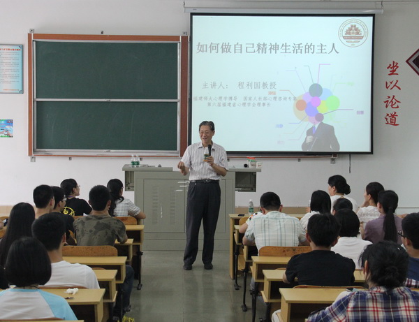 6月3日,“闽科讲坛”邀请福建师范大学心理学博士生导师、国家人力资源和社会保障部心理咨询专家、第六届福建省心理学会理事长程利国作题为“如何做自己精神生活的主人”讲座。讲座由院关工委主任、光电信息科学系主任杨文琴教授主持。