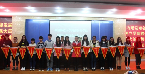 随后,周勇军副院长宣读了2014—2015年度精神文明建设先进集体和先进个人表彰名单。主席台领导为获奖单位代表和个人颁奖。会议表彰了学院办公室等5个单位“2014-2015年度精神文明建设先进集体”称号,孙文缘、陈秋萍等8名师生“2014-2015年度精神文明建设先进个人”荣誉称号,林佳喜、潘昊炜等3个家庭“2014-2015年度精神文明建设文明家庭”称号,康美校区兰苑6#611、美林校区菊苑A#401等16间宿舍“2014-2015年度精神文明建设文明示范宿舍”称号。