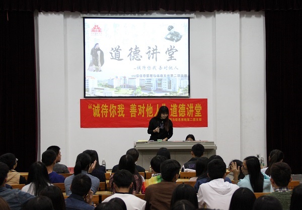 6日,2014级信息管理与信息系统专业举办“诚待你我,善对他人”主题道德讲堂活动。活动围绕“述一个道理”、“观一部短片”、“ 讲一段故事”、“唱一首歌”、“发一条微博”、“宣一则期望”、“听一番感悟”、“签一个名字”八个环节展开。活动在一首“友善”为主题的诗歌中“述一个道理”开场;在“观一部短片”环节中,以一位流浪汉被善待的感人故事,宣传道德正能量;在“讲一段故事”环节中,同学们踊跃发言,讲述自己身边被善待的生活情节;在“唱一首歌”环节后,同学们通过“发一条微博”发表自己对“善待”的看法,并承诺:“无论是朋友还是陌生人遭到了危险,我们都要大胆地承担下来,尽力帮助人家,不要过多考虑自己要付出多大代价。”在“听一番感悟”中,经济管理系副主任陈晓川分享了善待他人,也得到他人善待的故事,他希望同学们终生铭记“诚待你我,善对他人”这个承诺,以真诚和善良对待身边的人和事,以“诚待你我,善待他人”的态度与人交往,在学习生活中形成良好融洽的人际关系,在实践中弘扬道德新风尚,传播社会正能量。