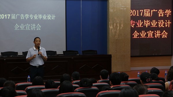 会上,吴勇副院长介绍了我院近年来在教学创新实践方面的主要做法,并肯定了广告学专业在毕业设计方面的有益探索。他希望以此次宣讲会为契机,将校企合作推向新的高度,真正实现无缝对接。同时,勉励同学们要珍惜在企业学习的机会,端正态度,为实习单位多做贡献,展示闽科学子良好精神风貌。