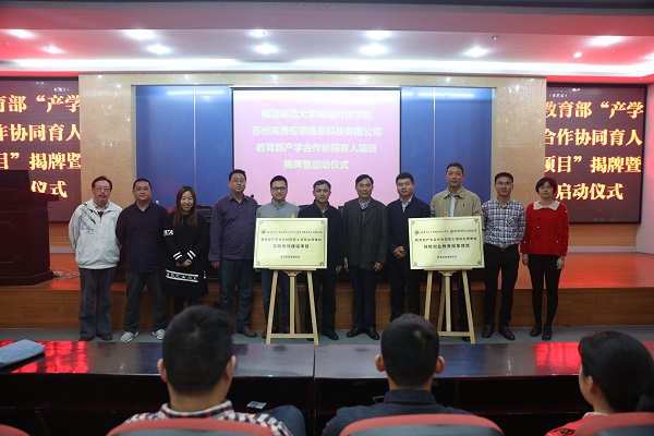 4月12日,福建师范大学江南官方网站▪高博应诺“教育部产学研合作协同育人项目”揭牌暨启动仪式在我院学术报告厅举行。苏州高博应诺信息科技有限公司总经理周世锋、副总经理兼教学总监张益桃,院领导邱永渠、李彬源、吴勇,相关系部负责人、教师代表及2014级计算机科学系部分学生共同参加了启动仪式。启动仪式由副院长吴勇主持。