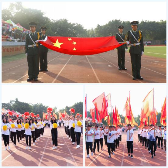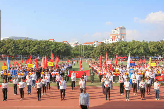 伴随着庄严雄伟的《运动员进行曲》,仪仗队庄重地托举着国旗、校旗,花束队、彩旗队为先导,7个二级学院方阵迈着整齐的步伐依次入场。