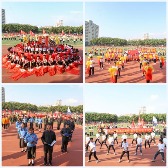 在入场式中,各二级学院表演队伍,合着激情飞扬的节拍热情放歌、变幻舞姿、组合图案,运用彩旗、彩扇、卡纸、运动器材、工程器械等道具,融入歌舞、朗诵、啦啦操、运动表演等多种形式,创意独特、精彩纷呈的表演博得现场阵阵掌声。其中,商学院代表队推出5支展示专业名称的帆船,在波动的红扇中扬帆起航,乘风破浪;生命科学与化学学院代表队模拟表演运动竞技,一曲《北京欢迎你》惊艳全场;计算机信息学院代表队借用电脑元素展示专业特色,并演绎不同类型舞蹈;光电信息学院代表队身着民国服饰,齐声朗诵爱国诗歌《岳飞》,搭配活力现代舞,展现新时代、新生活、新面貌;土木工程学院代表队的专业测绘仪器、安全头盔和工作服饰,尽显专业风采;人文学院代表队的活力啦啦操,洋溢着青春与活力;艺术设计学院代表队以向日葵为道具,摆出“70”字样,礼赞新中国成立七十周年;最后,教职工代表队挥舞红旗,气宇轩昂走进运动场。