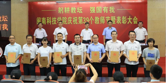 9月13日下午,我校隆重召开庆祝第39个教师节暨表彰大会。校领导游小波、李旭、周勇军、林树生、邱永渠出席表彰大会。校长游小波代表学校党政致辞。常务副校长周勇军、副校长邱永渠宣读表彰名单。表彰大会由校党委书记李旭主持。