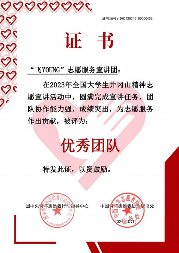 近日,团中央青年志愿者行动指导中心、中国青年志愿者协会秘书处公布了2023年全国大学生井冈山精神志愿宣讲团优秀团队名单,我校“飞YOUNG”志愿服务宣讲团从全国1000支团队中脱颖而出,获评为全国“优秀团队”。
